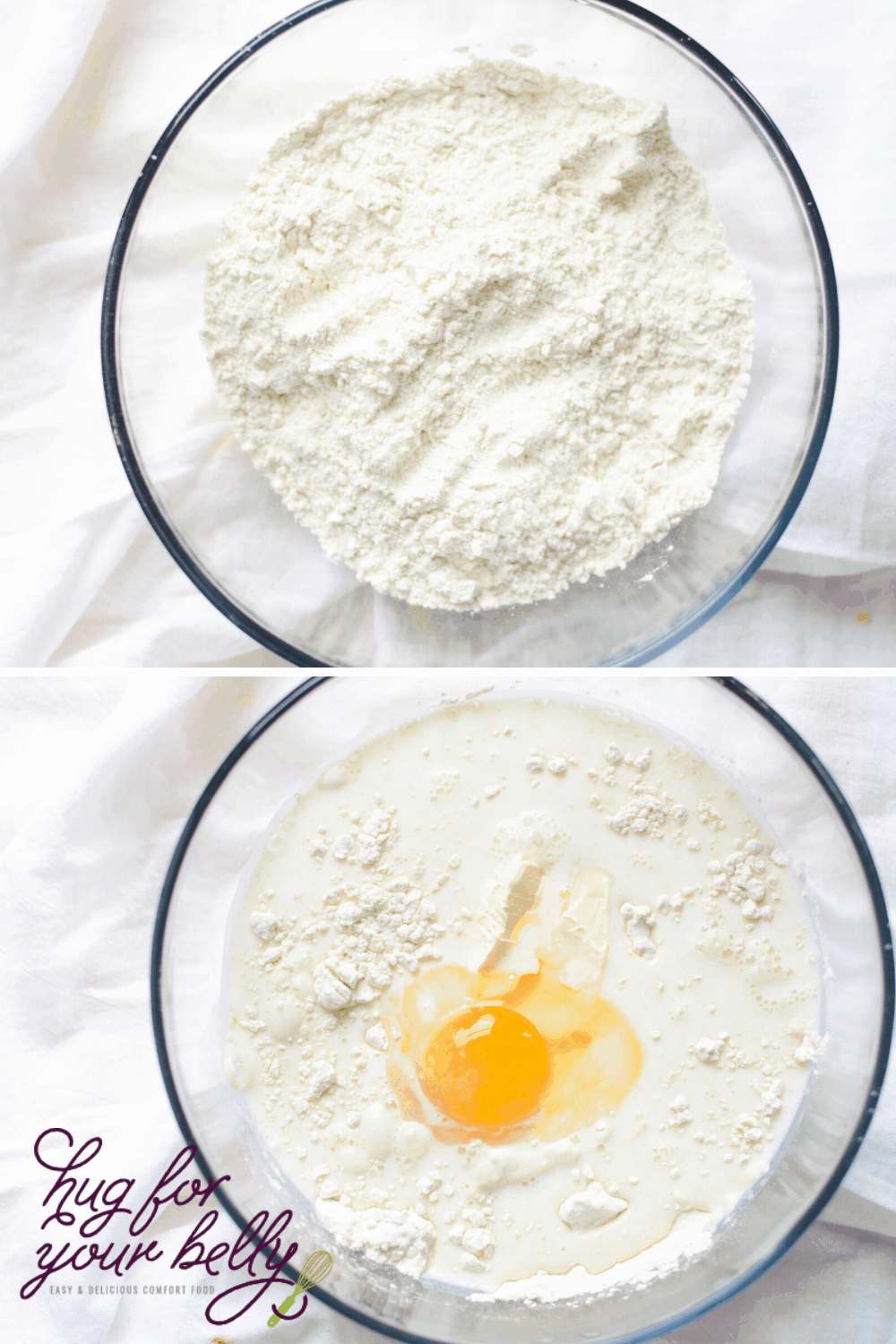 - Add milk, egg, and butter and combine.